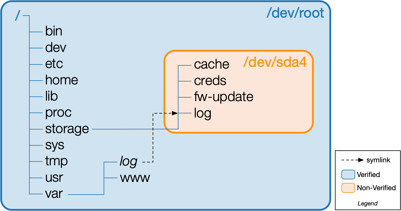 It is vital to include the root filesystem in the verification chain. However, this presents the embedded developer with a problem: since the root file system has been cryptographically signed, it can neither be changed nor used to store persistent data. Where then can an embedded developer store device-specific data such as configurations and logs between reboots? A common solution is to create an unprotected storage partition for non-volatile data (data that can be retrieved after power cycling) and mount it in a location such as /storage.
