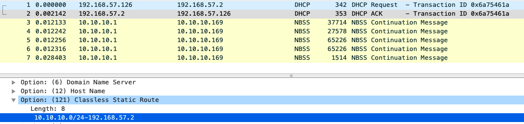 When the router’s DHCP lease expired, our malicious DHCP server slipped in a Classless Static Route to route the internal LAN network 10.10.10.1/24 out to a WAN IP address: