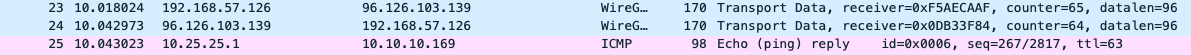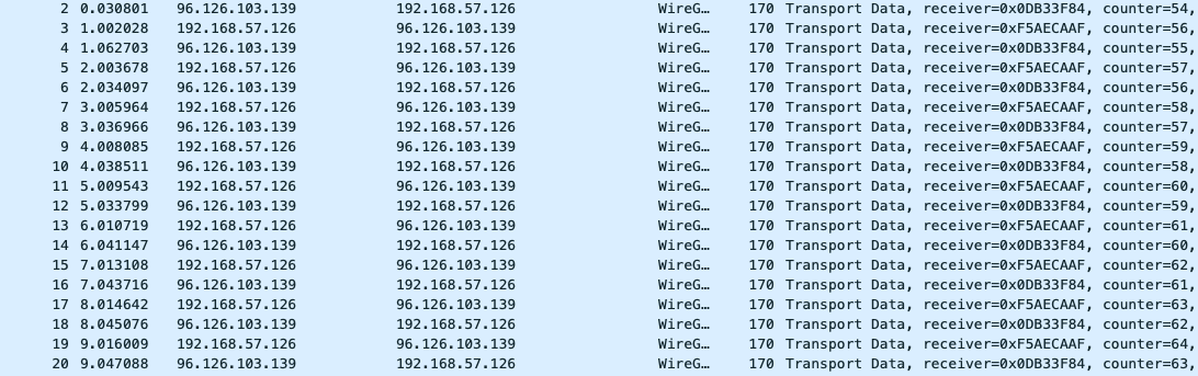 In this example the smart router device is configured with a site-to-site VPN to a remote office and tunnels any traffic from the internal LAN to the remote office through the VPN. We then started pinging a host on the other side of the VPN from a LAN host. Sniffing on the WAN interface, we can see the encrypted Wireguard VPN packets containing the pings: