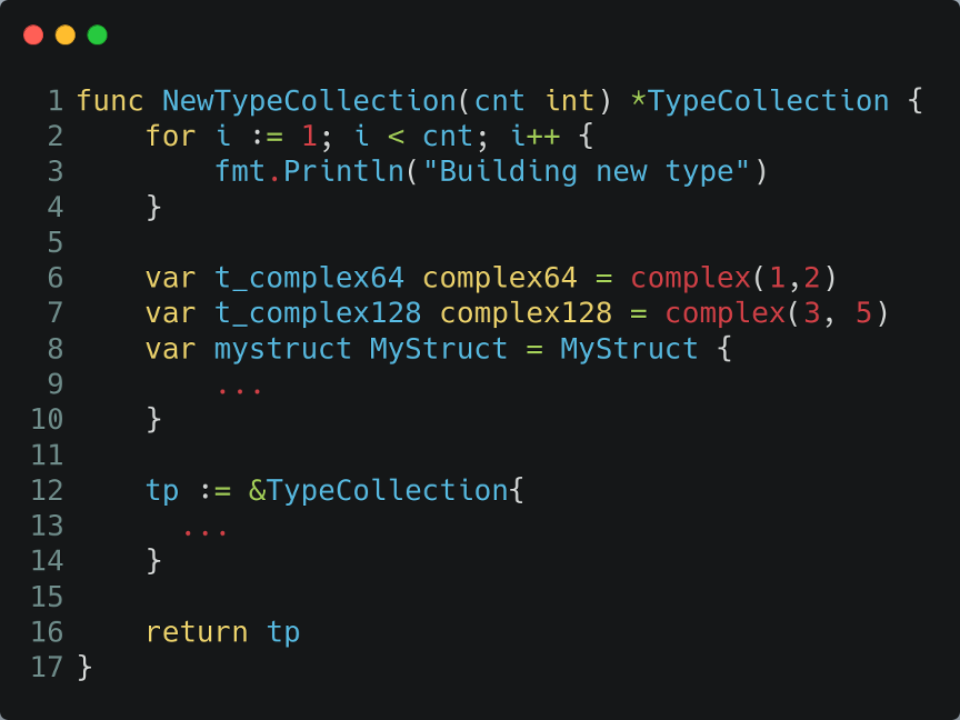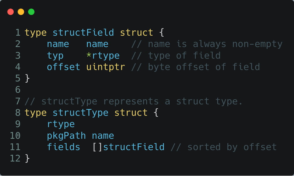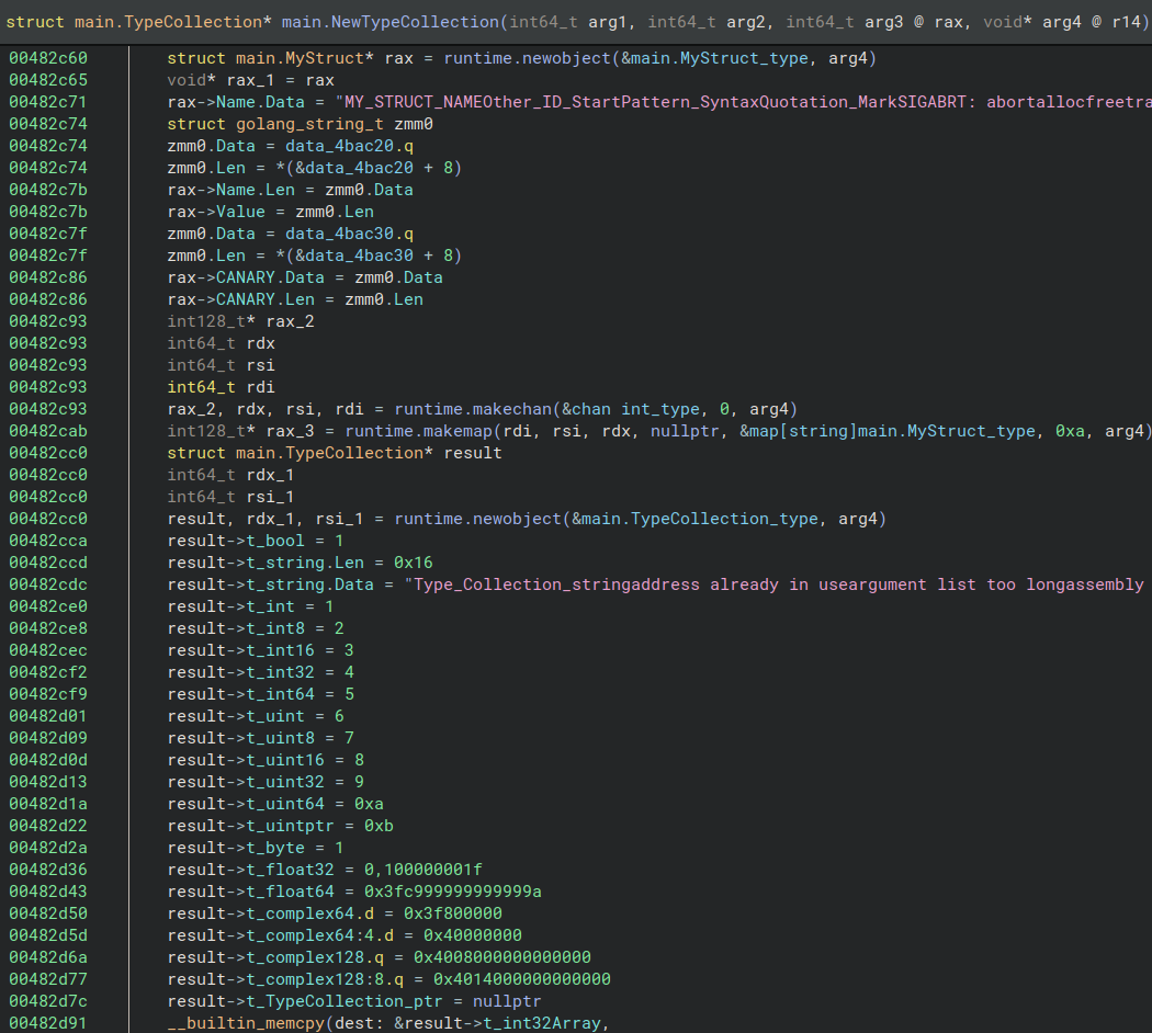 Another interesting piece of information contained in Go binaries is the type of information. Take for example the below source code for a simple go executable. It creates two objects: one of type MyStruct and another of type TypeCollection, respectively on lines 8 and 9.