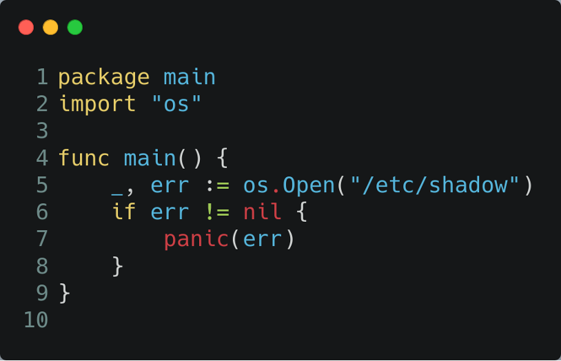 Take for example the following go program which will try to open the file “/etc/shadow” and panic if there is any error.