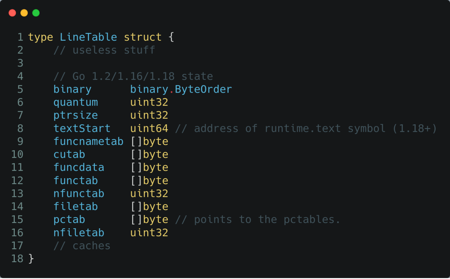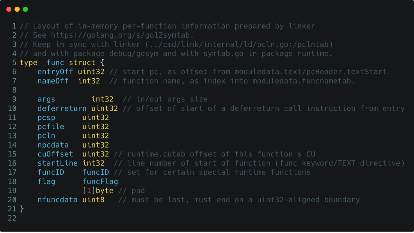 To fully understand the inner working of the plugin the first piece of information one must understand is the gopclntab. The full name may give some hint about its scope, in fact gopclntab stands for “program counter to line number”. But let’s see it in action!
