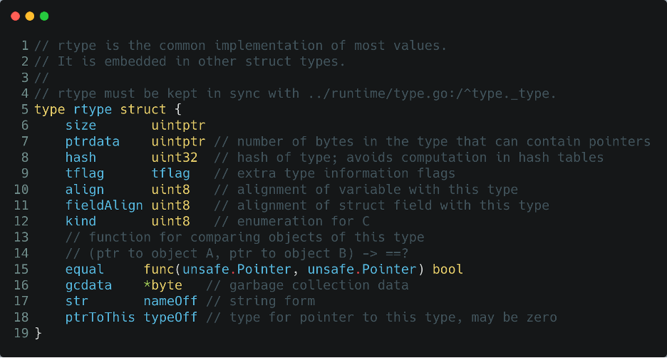 This is another treasure of information for a reverse engineer. This because the rtype definition, the object passed to runtime.new/newobject, contains information about: