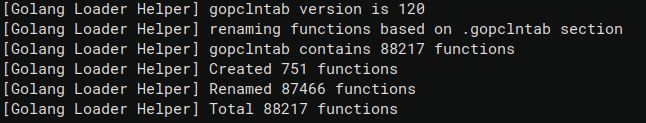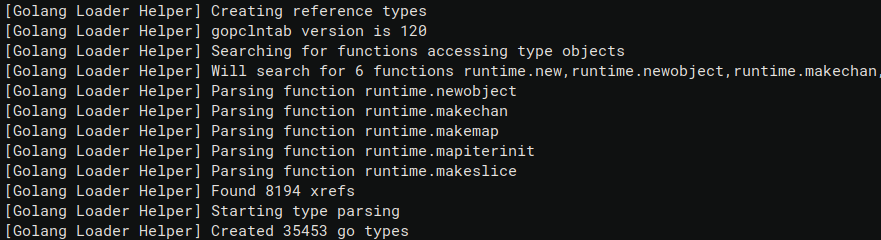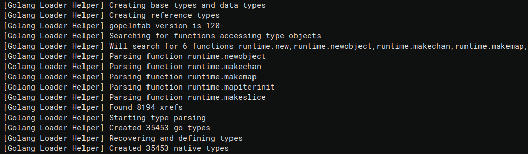 Similarly to the other commands, the Log window will contain the messages printed by the plugin. The output is very similar to the “Recover Go types” one but it is nice to see that we were able to create 35453 native types!
