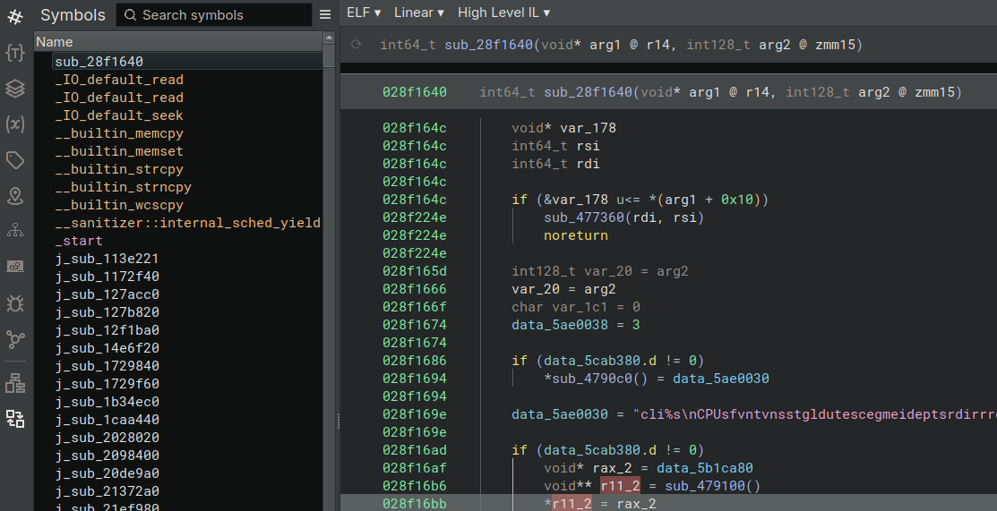 Let’s now showcase some of the functionalities of the plugin and the information that can be recovered. All the examples are based on nuclei version 3.3.10, which was chosen for two main reasons: it is open-source, so it is easy to compare the plugin’s output with the source code and it is a large binary, with a size of roughly 90 Mb, useful to stress-test the code.