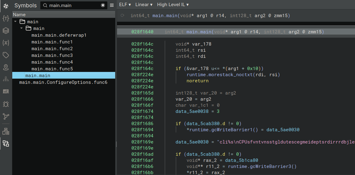Now the state after the plugin execution: the function main.main has its proper name and it is organized in the correct container (on the left). The plugin was able to recover also the runtime functions like runtime.morestack_noctxt or runtime.gcWriteBarrier1, functions which we will be very happy to ignore when reverse engineering.