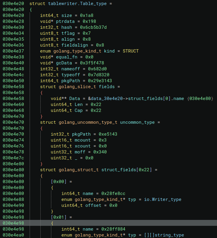 Once parsed, the same data at 0x30e4e20 makes more sense. It is a STRUCT (looking at the kind field) called tablewriter.Table_type and it has 34 ( the Len of the fieds field) fields, each one with its own name (name field) and type (typ field).