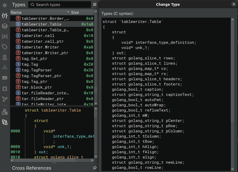 If we go back to our function tablewriter.NewWriter, we can see how having the type definition changes the readability of the function. Once we assign the type tablewriter.Table (actually a pointer) to the return value of runtime.newobject, the access to the structure table_writer becomes clear and understandable.
