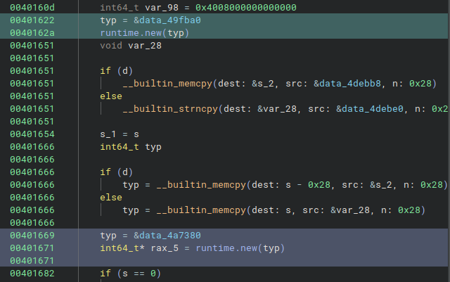 The first one is the automatic application of the type as return for the functions like runtime.newobject and the other allocations functions, action which is currently manual. The plugin does not do it automatically because the go calling convention is, let’s say a moving target. So to avoid messing up the database and propagating wrong information, I decided to leave it to the user the task of assigning the type.