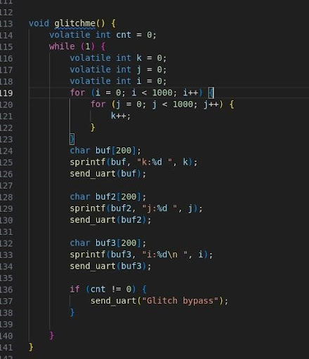 This routine is a good example for experimenting with various glitch parameters, allowing for the observation of their effects and optimizing the fault injection process.