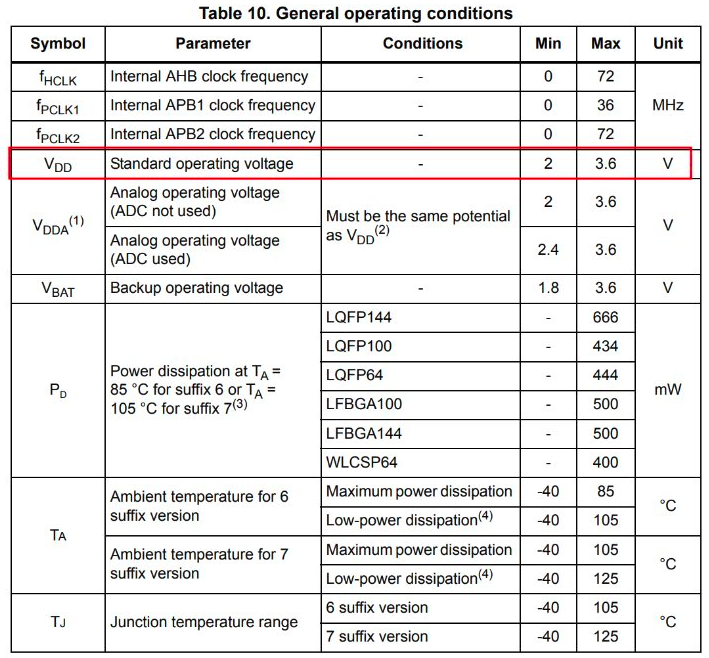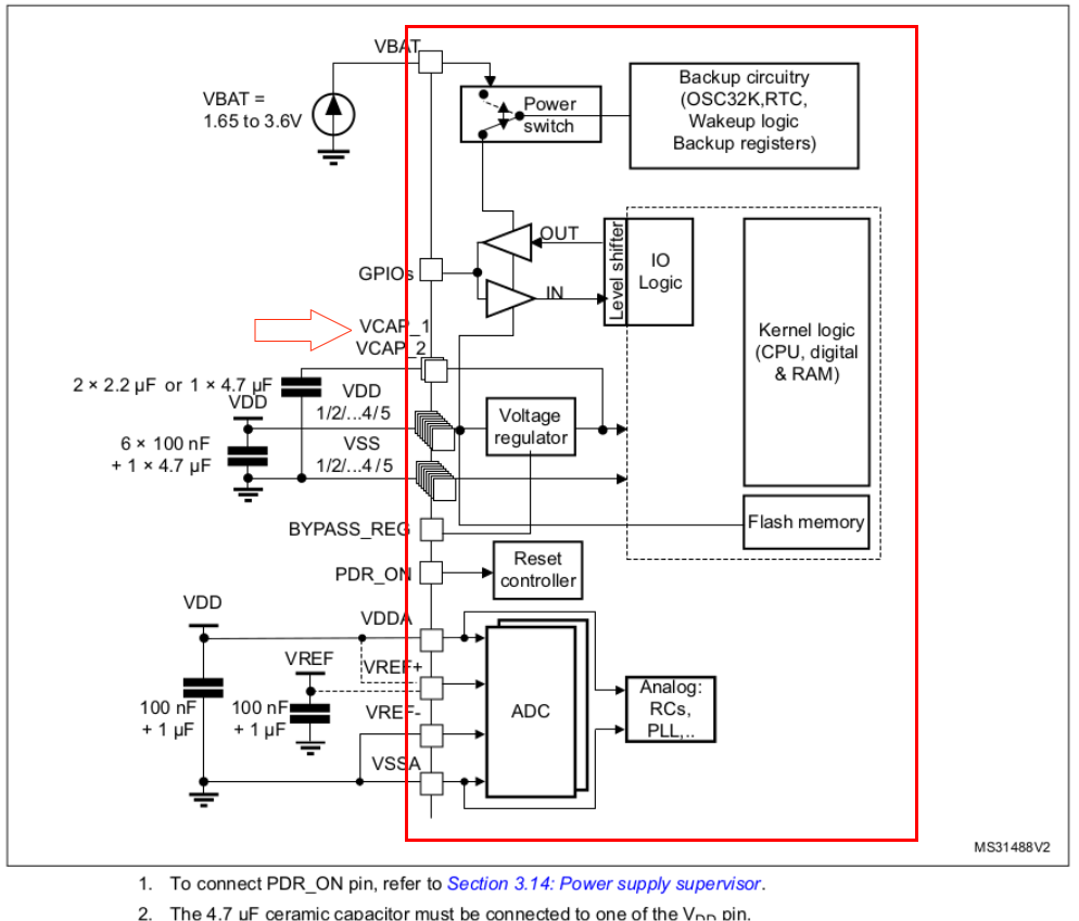The power supply schema for the STM32 device is shown below. The red rectangular box highlights all the components inside the MCU.