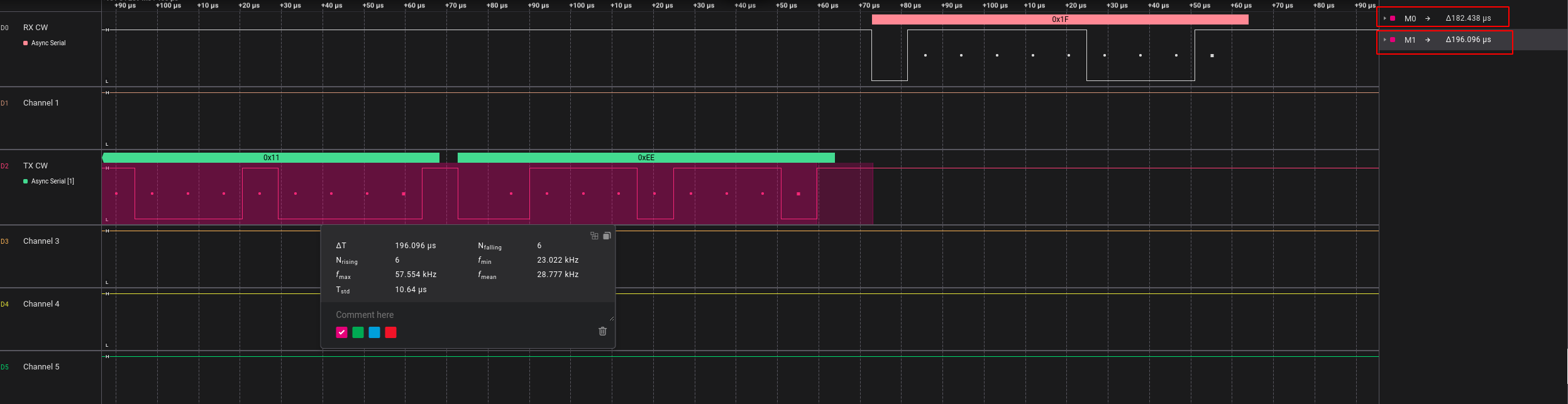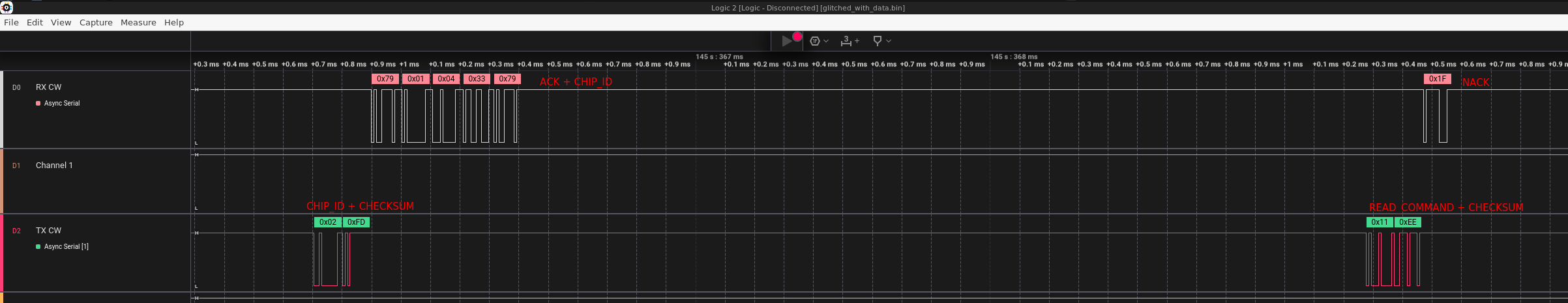 A logic analyzer was employed to measure the timing of the transmission and reception of the 0x11 read command. The software provided with the logic analyzer includes a precise timing measurement feature. This feature allows for accurate measurement of the exact time intervals between when the 0x11 command is transmitted and when the instruction is fully received and processed, helping to determine the ideal moment for the glitch injection.