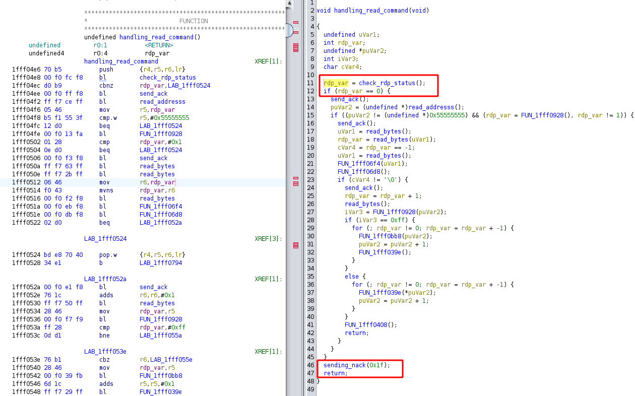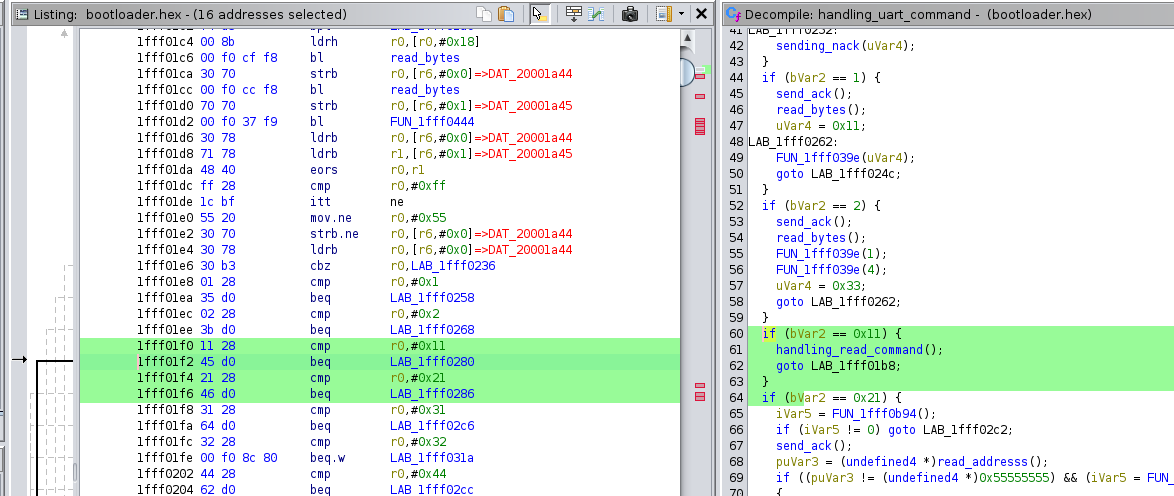 By examining the bootloader's disassembled code, it can be observed how incoming commands are parsed and processed. The following screenshot provides a closer look at the parsing logic:
