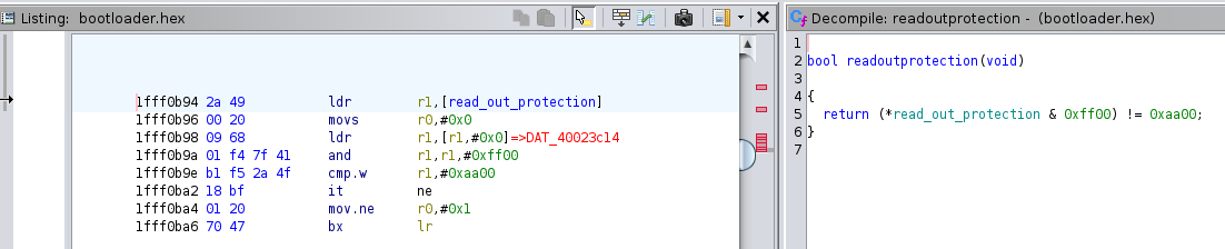 To gain insights into this feature’s underlying implementation on the target, reverse-engineering approach was applied to the system bootloader. This analysis aims to better understand the mechanisms enforcing the RDP mechanism on the target.