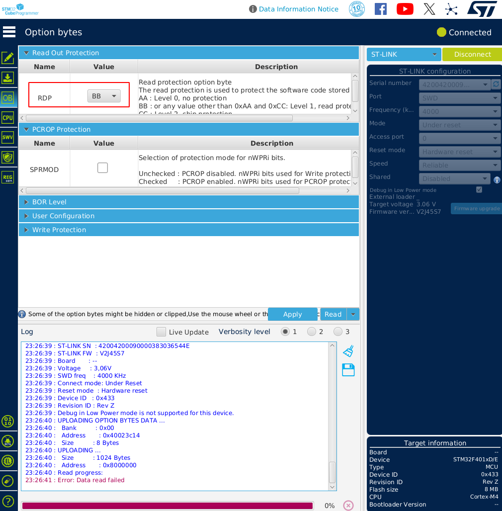 The STM32 device was programmed with dummy firmware for testing purposes, and the RDP was enabled. The configuration settings are illustrated in the image below: