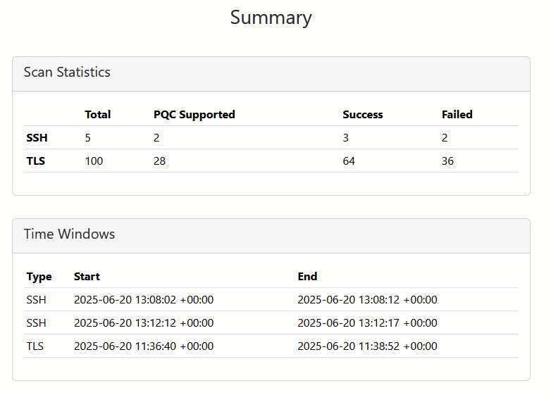 Reports of SSH and TLS scans can easily be combined into one HTML report. For each scan it will show display the time windows as well. Simply pass in all the scan output JSONs one by one to PQCscan as follows: