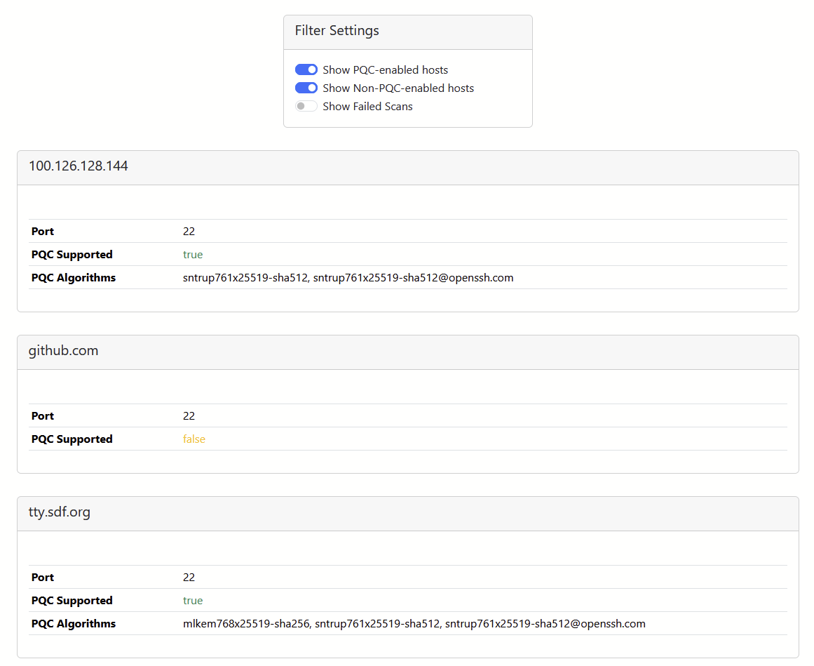 $ cat > ssh_targets| 100.126.128.144:22 github.com:22 notexisting:55 $ pqcscan ssh-scan -T ssh_targets -o ssh.json $ pqcscan create-report -i ssh.json -o report.html
