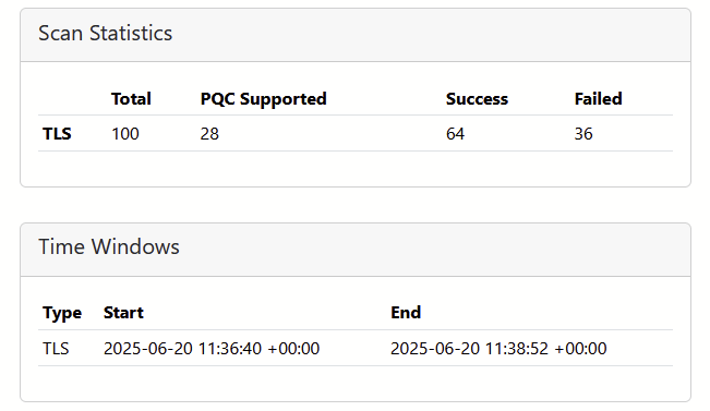 $ cat cloudflare-radar_top-100-domains_20250620.csv | tail -n +2 - | cut -d ',' -f 2 | sed 's/$/:443/' > top-100-targets $ pqcscan tls-scan -T top-100-targets -o top-100-scan.json $ pqcscan create-report -i top-100-scan.json -o top-100-report.html