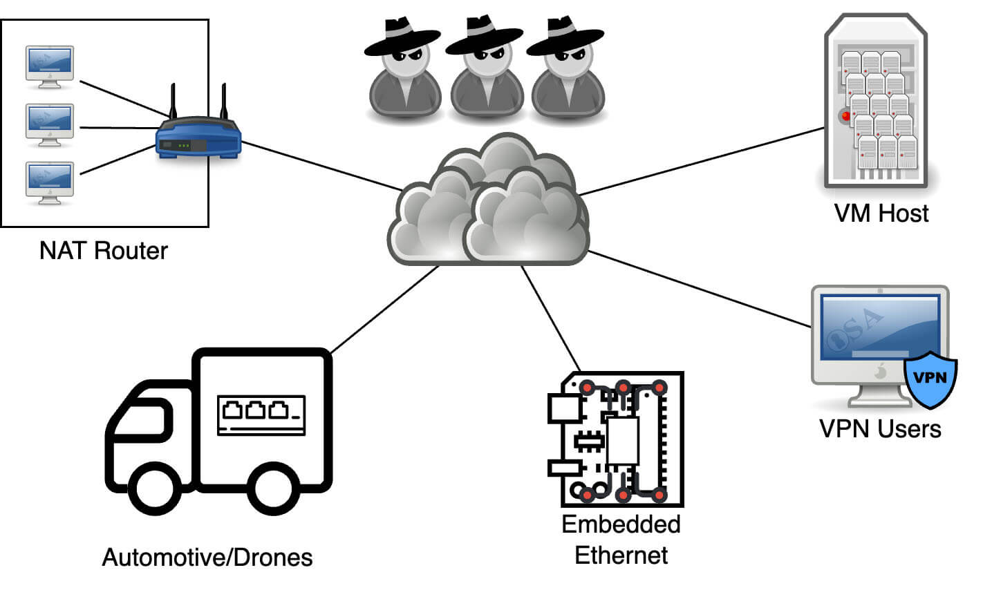 NAT routers are an obvious target, but multihomed devices appear in many other contexts as well. For example, when you spin up a virtual machine, the Linux host is connected to multiple networks—some of which may be virtual—but this distinction is irrelevant to conntrack. VPNs are similar, though they may include their own packet filtering components. Embedded devices, automotive systems, and drones can also be vulnerable, as many of these devices contain internal networks for sensors and other components.