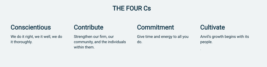 Culturally, we have embraced being an employee-owned and directed firm that is always looking to improve and accepting iterative change as part of how we do things. We spend time measuring and analyzing our ability to improve in ways that are commensurate with our financial wherewithal. I call it “keeping balanced” and this concept really works for our team. Anvil is also developing programs that align with this idea of “this is where we are” and, based on that, these are things we can do: including personnel matters like size of training budgets, plans for introducing new incentive plans, building new programs for diversity and mentorship. These are all good things; but like any good thing, they have to remain balanced by the delivery of quality work product so that we can continue to do them.